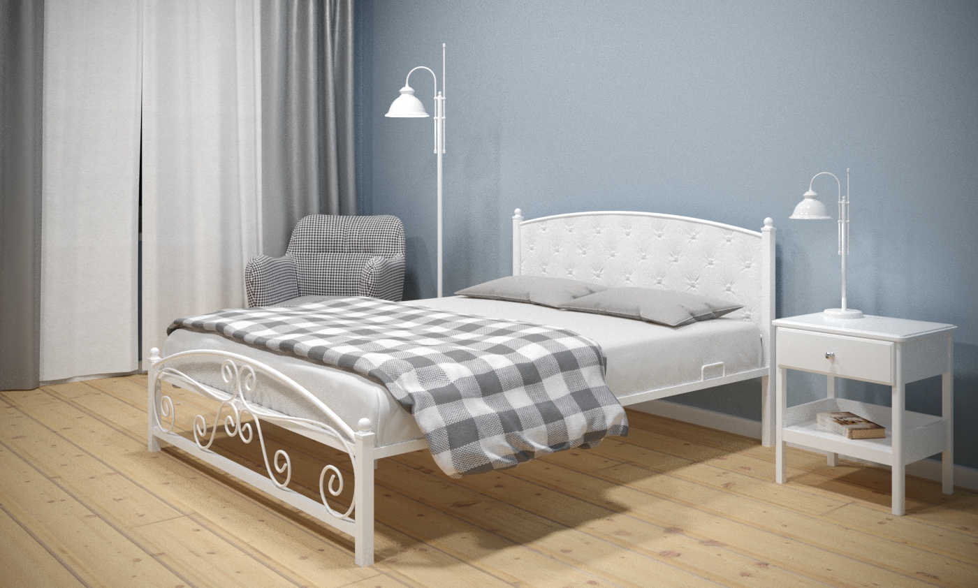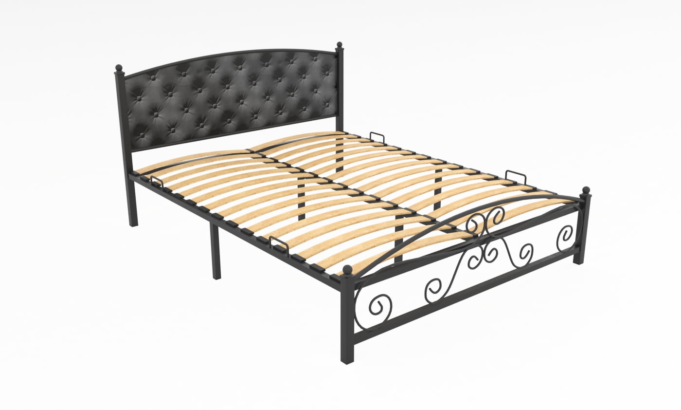 Кованая металлическая кровать Диана с мягким изголовьем — прекрасный выбор для комфортного сна. Особую неповторимость облику кровати придает каретная стяжка изголовья и декоративные элементы изножья. Материал изголовья: экокожа либо велюр Ares. К ней отлично подойдет матрас ЭОС Тип 5а.
