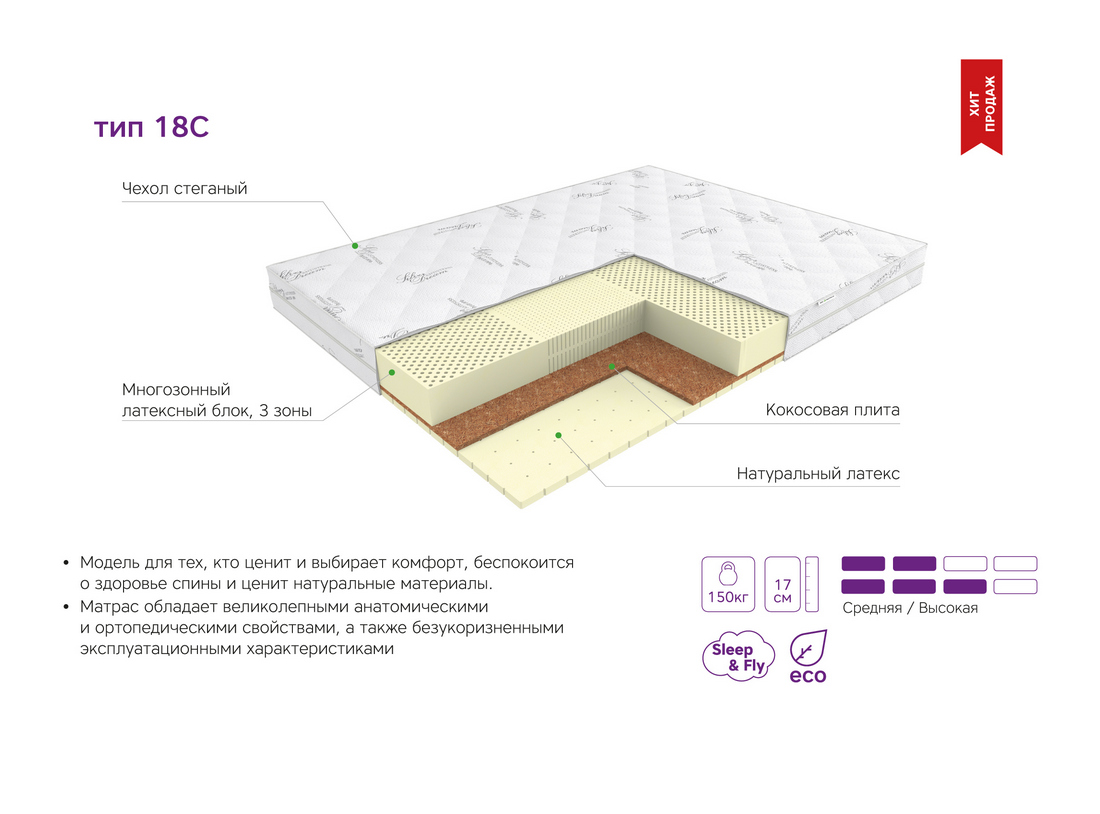 Матрас EOS Элит 18С – это модель для тех, кто ценит и выбирает комфорт, беспокоится о здоровье спины и ценит натуральные материалы. Матрас обладает анатомическими и ортопедическими свойствами.