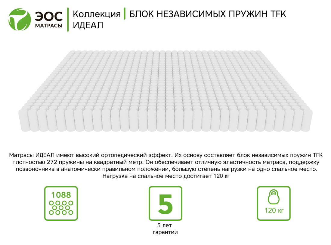 Созданные из экологически чистых и натуральных материалов матрасы коллекции «Идеал» имеют высокий ортопедический эффект и обладают высокими прочностными характеристиками. Их основу составляет блок независимых пружин TFK в котором каждая пружина блока находиться в отдельном тканевом чехле, что обеспечивает отличную эластичность матраса и поддержку позвоночника в анатомически правильном положении.