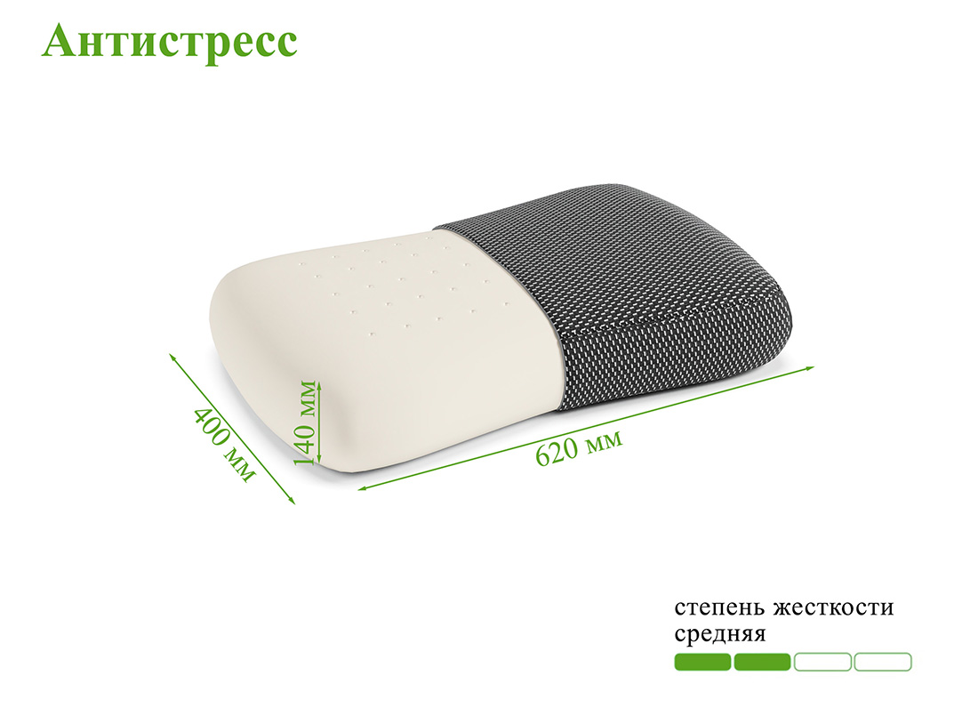 Подушка “Антистресс” создана для того, чтобы дарить комфортный отдых. Благодаря увеличенным размерам — 62х40 см — и классической форме, она удобна даже для тех, кто спит беспокойно и часто меняет положение во время сна. Подушка сделана из пены с эффектом памяти. Материал адаптируется под форму тела, поэтому обеспечивает идеальную поддержку шейно-воротниковой зоны и головы, снимая усталость и лишнее напряжение. В комплекте идет съемный чехол черного цвета со специальной вентилируемой вставкой, которая обеспечивает оптимальную циркуляцию воздуха во время сна.