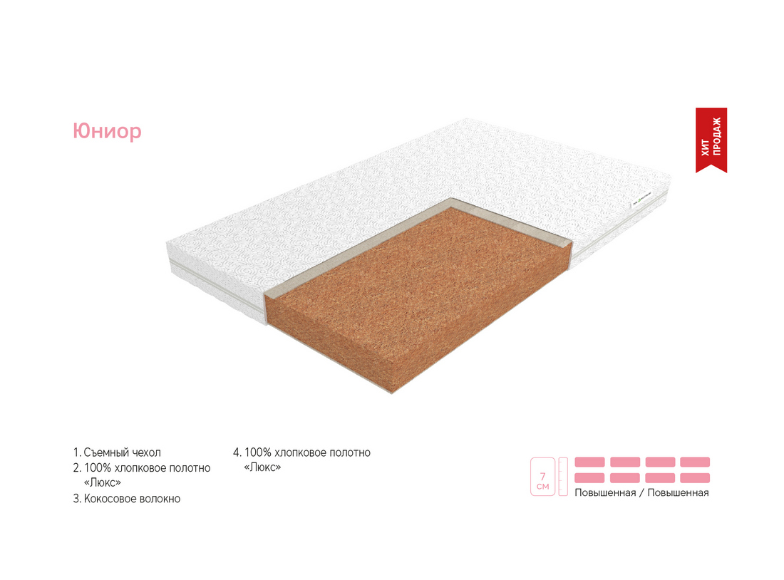 Детский матрас Юниор – двусторонний, симметричный. Матрас играет важную роль в формировании опорно-двигательного аппарата малыша. Эта модель будет не только контролировать положение позвоночника, но и обеспечит здоровый сон ребенка.
