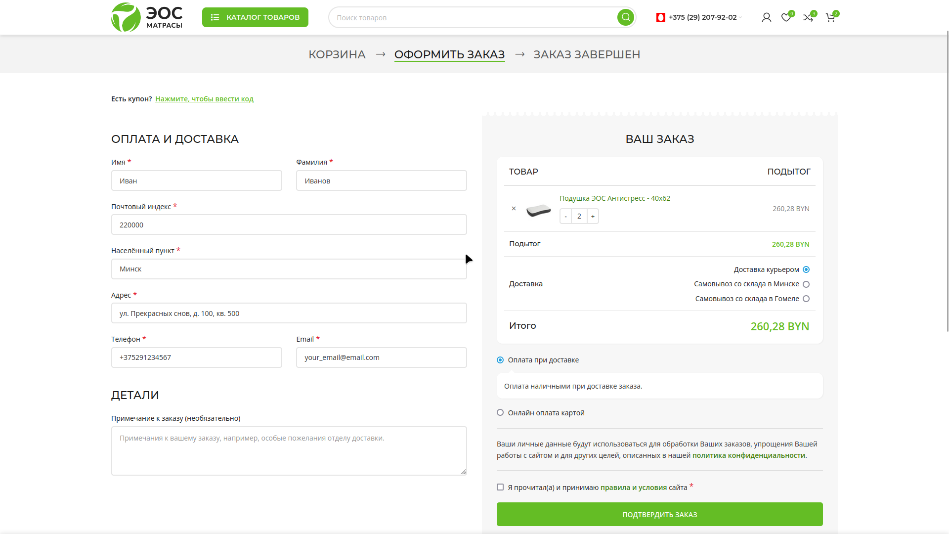 Если всё заполнено правильно, Вы будете перенаправлену на страницу подтверждения заказа.