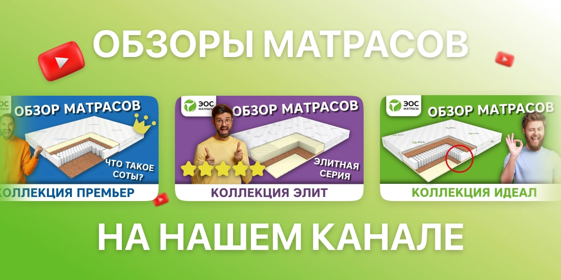 Это фирменный ютуб-канал компании ЭОС. Здесь вы можете посмотреть обзоры матрасов нашего производства, узнать о натуральных и экологически чистых материалах, из которых изготовлены наши матрасы, подушки и прочие аксессуары для сна (наматрасники, топперы, одеяла, постельное бельё и даже кровати!). Разобраться, какие виды матрасов бывают и в чём разница между независимым пружинным блоком и зависимым, а также понять что лично вам лучше подойдет — пружинный блок или беспружинный матрас. Кроме этого, мы рассказываем о здоровом сне, о том что нужно сделать, чтобы высыпаться по ночам, о том как правильно выбрать матрас или подушку. Мы поможем вам подобрать для себя и своих детей правильную жёсткость матраса, а также подскажем что вам больше подойдёт — пружинный блок, латекс, пена или пена с эффектом памяти.
